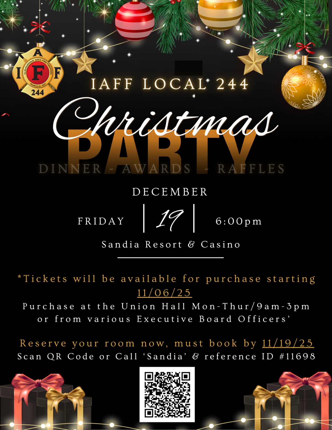 IAFF Local 244 Christmas Party  We will celebrate Christmas and honor our members from both chapters for Rookie of the Year, Firefighter of the Year and Outstanding Leadership on Friday, December 19, 2025, at Sandia Resort & Casino with cocktail hour at 6:00pm and dinner at 7:00pm.